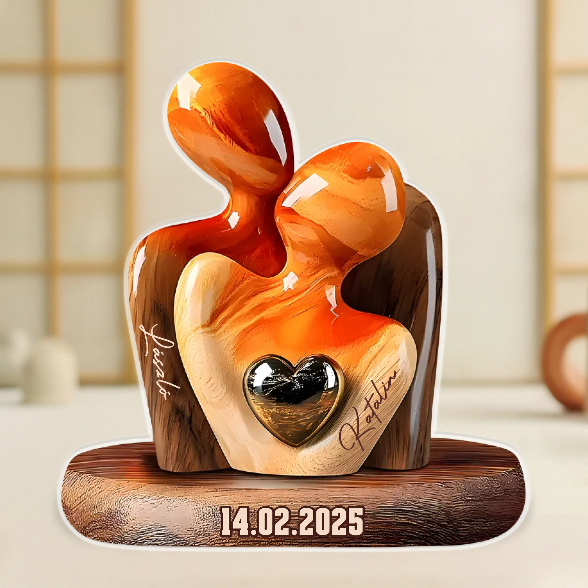 Az egymásba simuló alakok és a szívben rejlő arany fény az összetartozás csendes erejét idézik meg. Egy pillanat, ahol két élet eggyé válik – szeretetben, biztonságban, emlékekkel körülölelve.